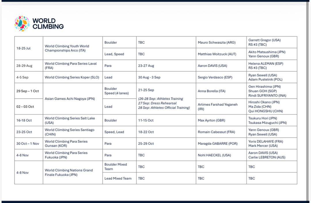 مطابق این جدول، مسابقات سنگنوردی بازیهای آسیایی ناگویا (ژاپن) در بخش سرطناب (Lead) طی روزهای ۲ و ۳ اکتبر ۲۰۲۶ برگزار خواهد شد و نام «آرتیمس فرشاد یگانه» بهعنوان سرطراح این بخش در فهرست رسمی طراحان درج شده است.
