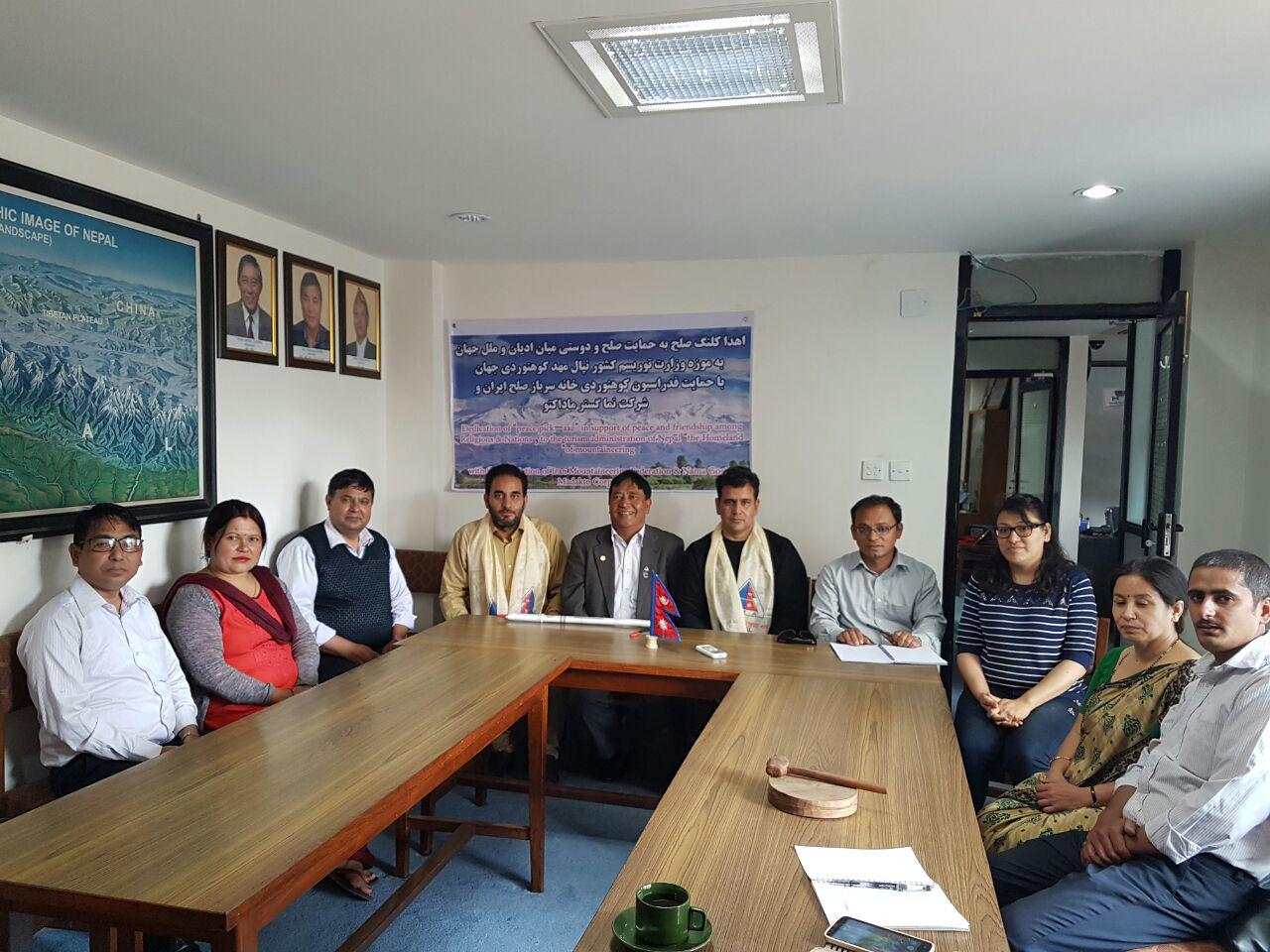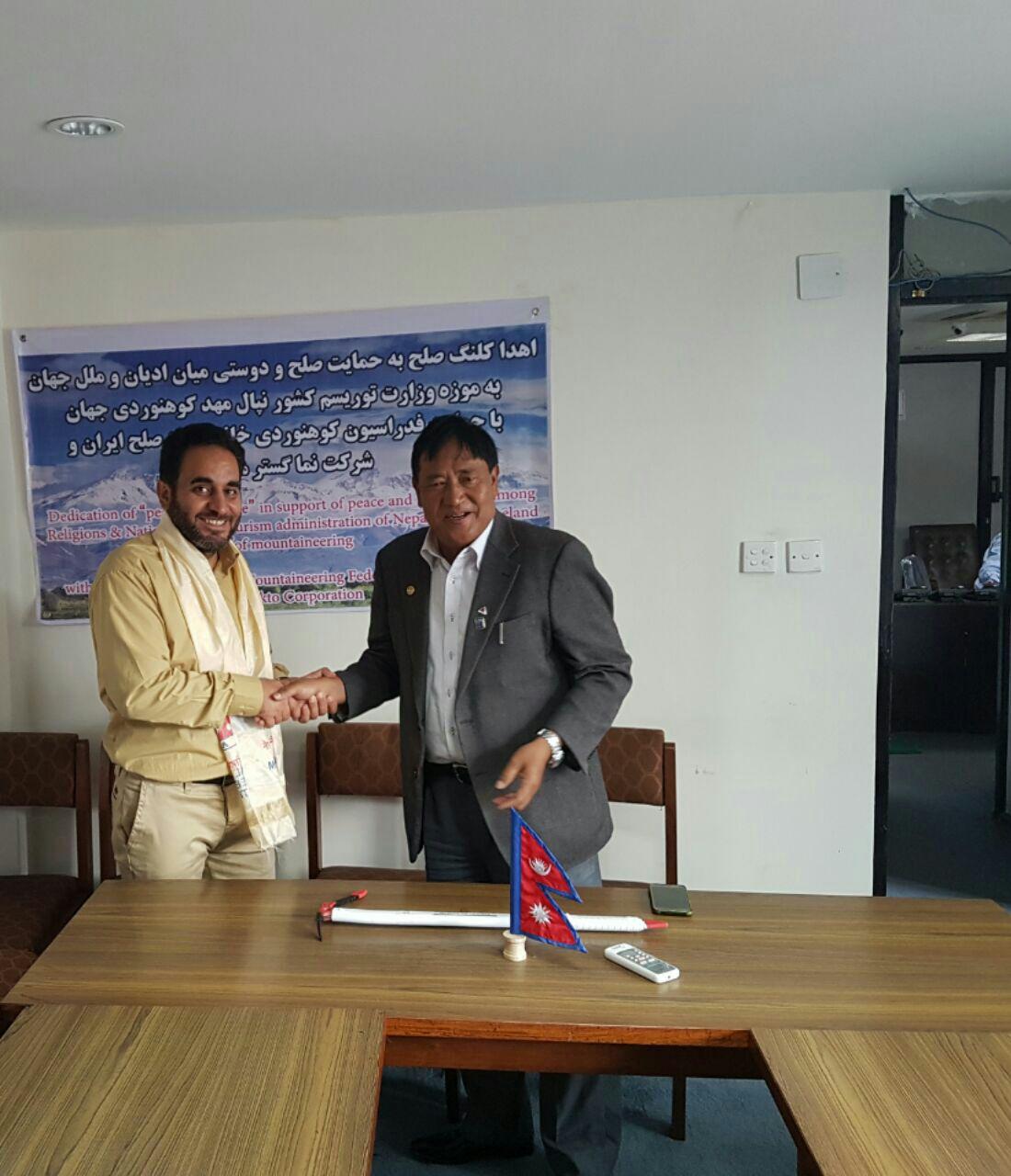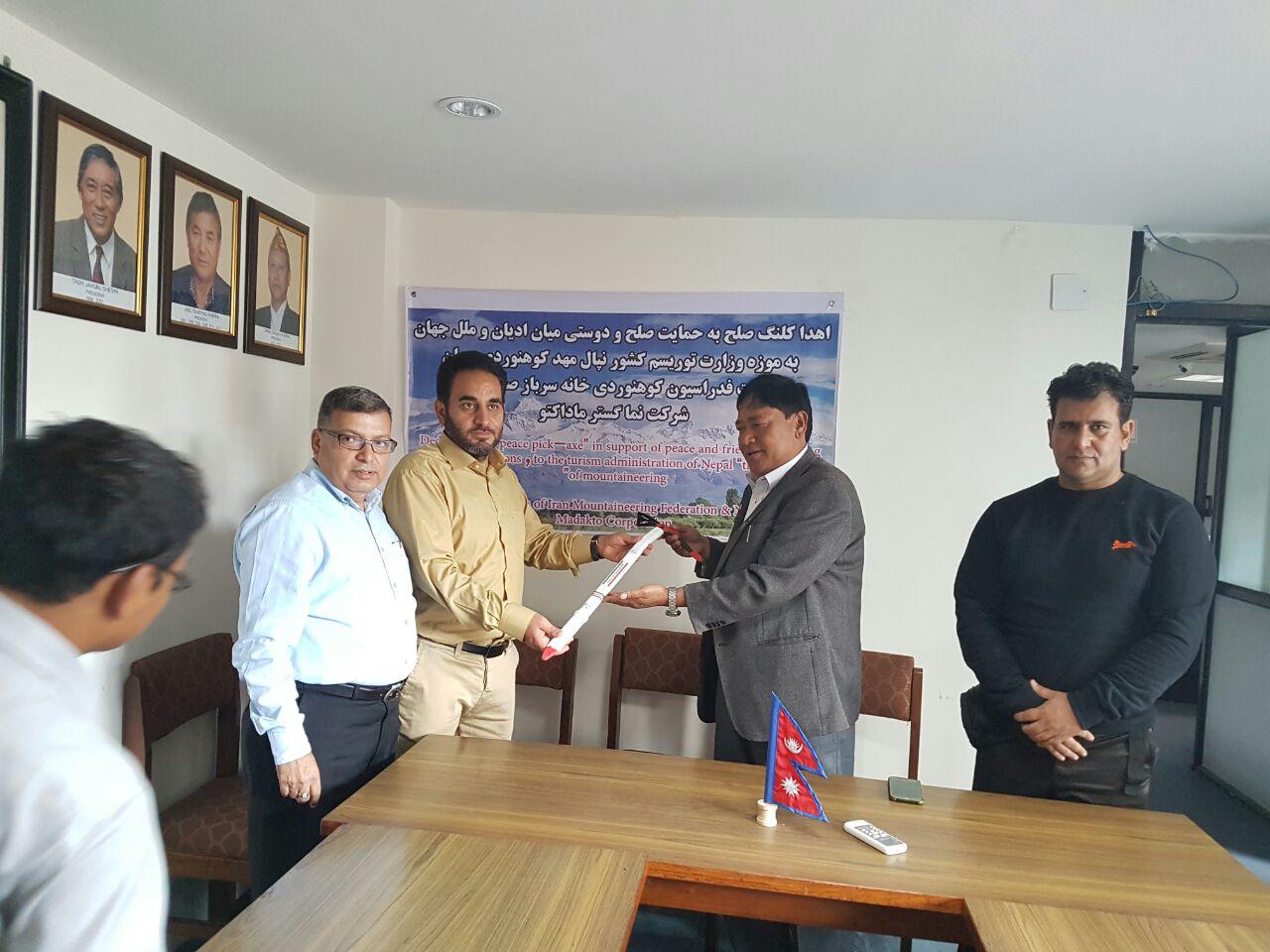 روز دوشنبه مورخه یکم آبان 1396  مراسم اهدا کلنگ سفید به فدراسیون کوهنوردی نپال با حضور نمایندگان صلح و دوستی فدراسیون کوهنوردی و خانه سرباز صلح ایران آقایان آرش قیاسیان و علی رحمانی در محل فدراسیون کوهنوردی نپال به جناب آقای جینش سین دوراکار تحویل گردید و در پایان ضمن قدر دانی از زحمات جناب آقای زارعی  رییس محترم فدراسیون ایران و گرامیداشت کوهنوردان فقید ایران مرحوم لیلا اسفندیاری و مهدی عمیدی ، موفقیت های ایرانیان و آقای عظیم قیچی ساز صعود کننده 14 قله هشت هزاری دنیا گرامی داشته شد و در پایان نشان فدراسیون کوهنوردی نپال به سفیران صلح و دوستی اهدا گردید و مقرر گردید کلنگ سفید که ساخته صنعت ایرانی و شرکت معتبر هفت گوهر میباشد به موزه ملی شهر بزرگ پوخارا تحویل وثبت گردد
